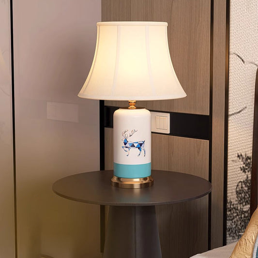 Deer Table Lamp White/Blue Ceramic Base Cream Linen Shade Chinoiserie Desk Lamp