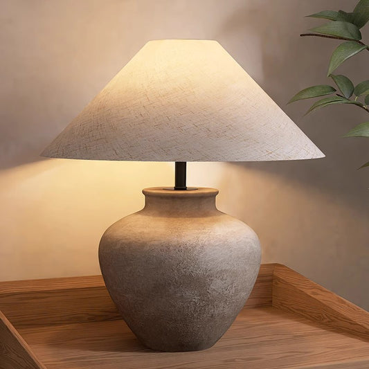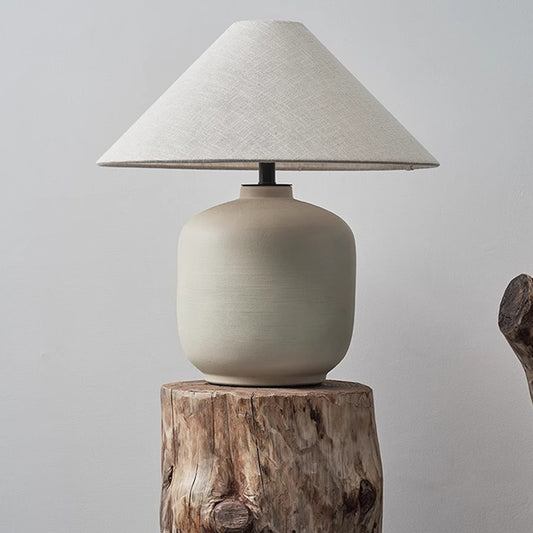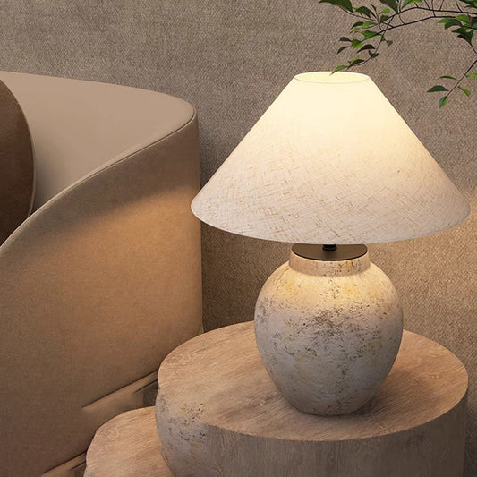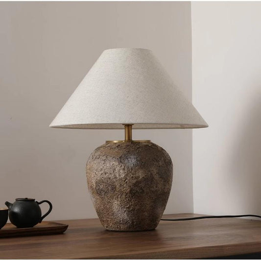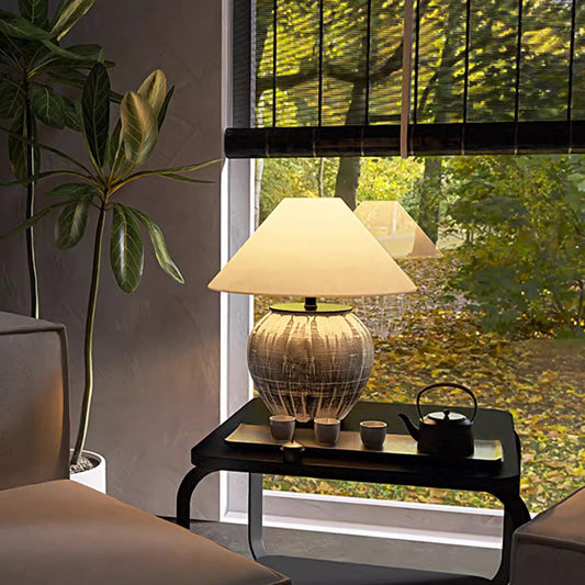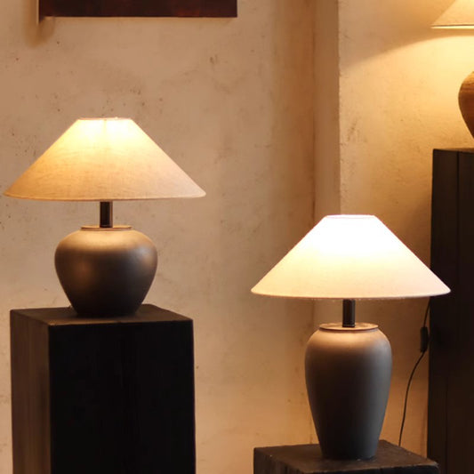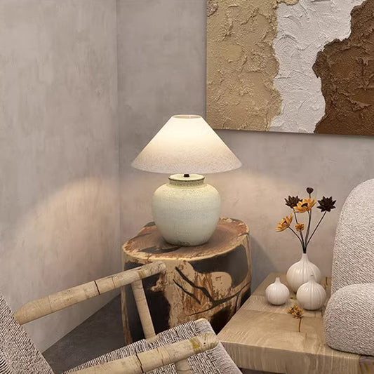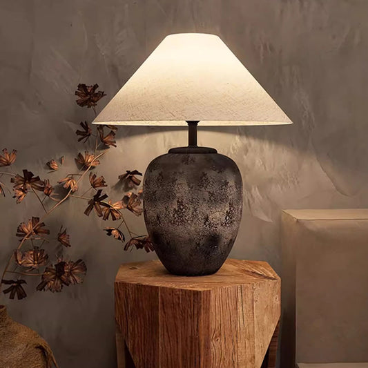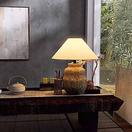 Wabi Sabi Style Ceramic Table Light Coarse Geometric Shape Table Lamp with Cone Fabric Shade for Bedroom